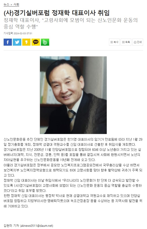 [2024. 2. 3] (사)경기실버포럼 정재학 대표이사 취임, "고령사회에 모범이 되는 신노인문화 운동의 중심 역할… 페이지 정보 작성자 관리자 댓글 0건 조회 124회 작성일 25-08-21 14:15 이전글 목록 본문 안양광역신문 - 2024. 2. 3. 목록 댓글목록 댓글목록 등록된 댓글이 없습니다.