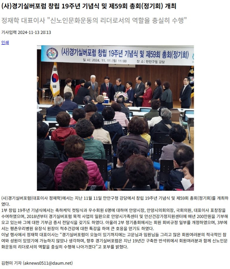[2024.11.13] (사)경기실버포럼, 창립 19주년 기념식 및 제59회 총회(정기회) 개최 정재학 대표이사 "신… 페이지 정보 작성자 관리자 댓글 0건 조회 144회 작성일 25-08-21 15:04 이전글 다음글 목록 본문 안양광역신문 - 2024. 11. 13 목록 댓글목록 댓글목록 등록된 댓글이 없습니다.