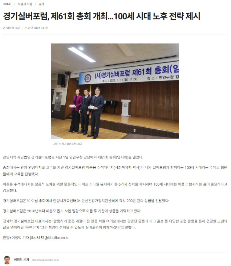 [2025. 4. 2] 경기실버포럼, 제61회 총회 개최…100세 시대 노후 전략 제시 페이지 정보 작성자 관리자 댓글 0건 조회 136회 작성일 25-08-21 15:10 이전글 다음글 목록 본문 기호일보 - 2025. 4. 2 목록 댓글목록 댓글목록 등록된 댓글이 없습니다.