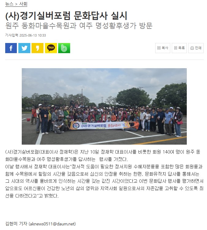 [2025. 6.13] (사)경기실버포럼, 문화답사 실시 원주 동화마을수목원과 여주 명성황후생가 방문 페이지 정보 작성자 관리자 댓글 0건 조회 145회 작성일 25-08-21 15:18 이전글 다음글 목록 본문 안양광역신문 - 2025. 6. 13 목록 댓글목록 댓글목록 등록된 댓글이 없습니다.