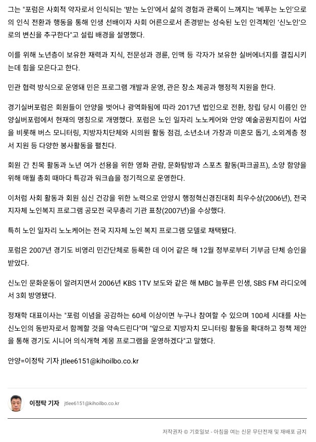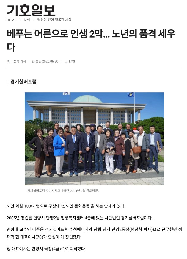 [2025. 6.30] 베푸는 어른으로 인생 2막… 노년의 품격 세우다 페이지 정보 작성자 관리자 댓글 0건 조회 130회 작성일 25-08-21 15:30 이전글 다음글 목록 본문 기호일보 - 2025. 6. 30 목록 댓글목록 댓글목록 등록된 댓글이 없습니다.