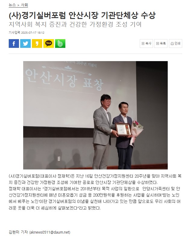 [2025. 7.17] (사)경기실버포럼, 안산시장 기관단체상 수상 지역사회 복지 증진과 건강한 가정환경 조성 기여 페이지 정보 작성자 관리자 댓글 0건 조회 147회 작성일 25-08-21 15:41 이전글 다음글 목록 본문 안양광역신문 2025. 7 .17 목록 댓글목록 댓글목록 등록된 댓글이 없습니다.
