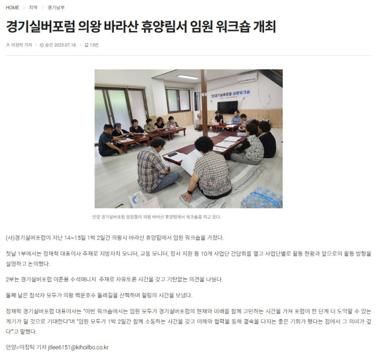 [2025 7.18] 경기실버포럼, 의왕 바라산 휴양림서 임원 워크숍 개최 페이지 정보 작성자 관리자 댓글 0건 조회 142회 작성일 25-08-21 15:43 이전글 다음글 목록 본문 기호일보 2025. 7. 18 목록 댓글목록 댓글목록 등록된 댓글이 없습니다.