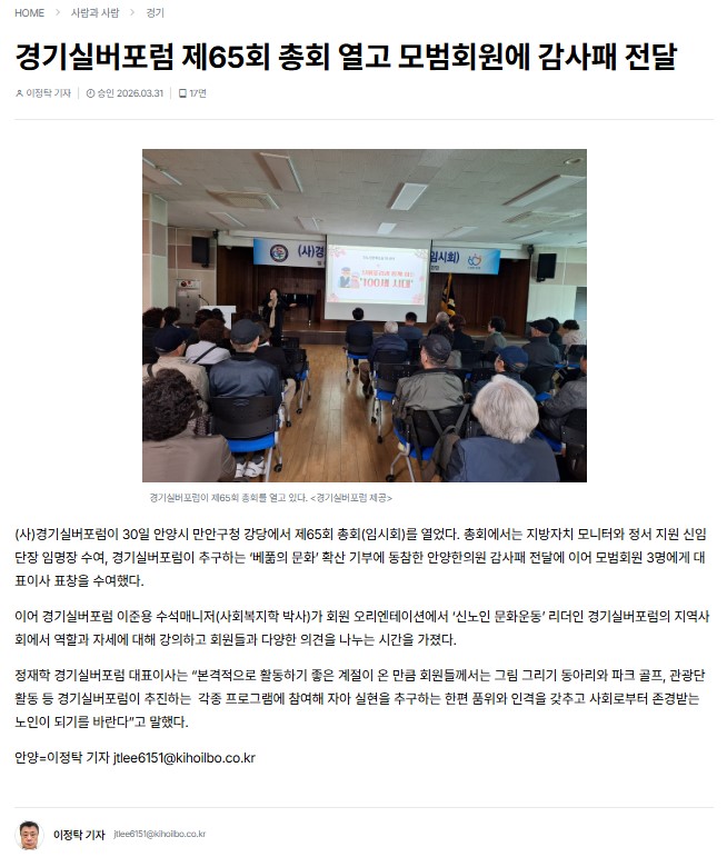 [기호일보 2026. 3.31] 경기실버포럼 제65회 총회 열고 모범 회원에 감사패 전달 페이지 정보 작성자 관리자 댓글 0건 조회 6회 작성일 26-03-31 15:26 다음글 목록 본문 기호일보 2026. 3. 31. 관련링크 https://www.kihoilbo.co.kr/news/articleView.html?idxno=3017884 3회 연결 목록 댓글목록 댓글목록 등록된 댓글이 없습니다.