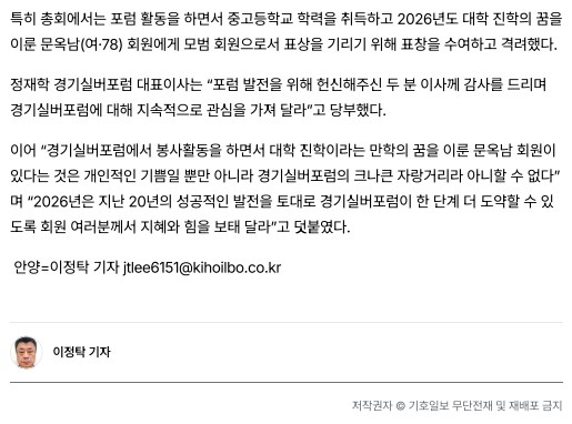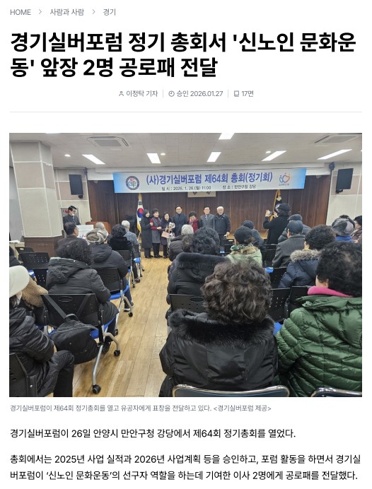 [기호일보 2026. 1.27] 경기실버포럼 정기 총회서 '신노인 문화운동' 앞장 2명 공로패 전달 페이지 정보 작성자 관리자 댓글 0건 조회 20회 작성일 26-01-28 12:19 이전글 다음글 목록 본문 기호일보 2026. 1.27. 관련링크 https://www.kihoilbo.co.kr/news/articleView.html?idxno=3011358 11회 연결 목록 댓글목록 댓글목록 등록된 댓글이 없습니다.